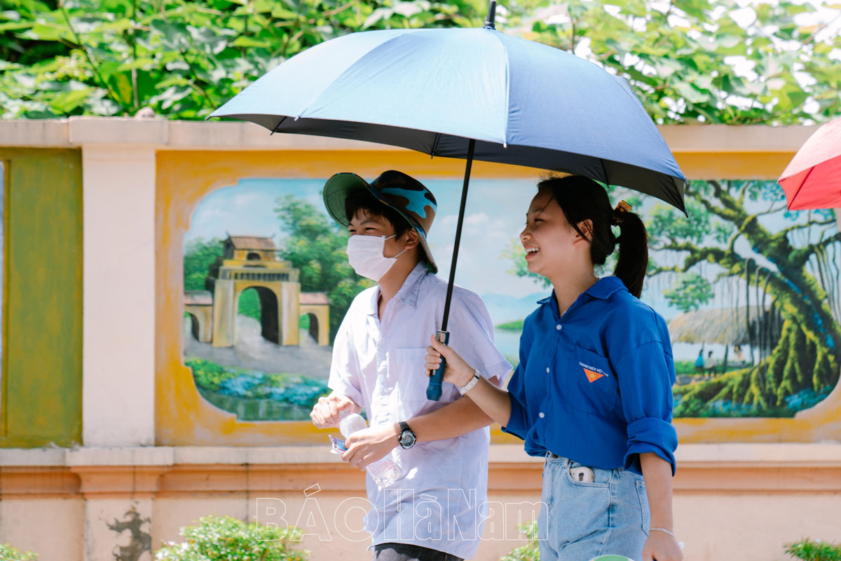 Điểm thi trường THPT Chuyên Biên Hòa sáng 29/5, 80 tình nguyện viên có mặt cùng với các lực lượng tổ chức thi vào lớp 10 THPT Chuyên Biên Hòa thực hiện nhiệm vụ tiếp sức mùa thi.Những áo xanh tình nguyện như tiếp thêm tinh thần, cổ vũ thí sinh lạc quan, tin tưởng, bước vào kỳ thi.Tình nguyện viên hỗ trợ che mưa cho các thí sinh thi vào lớp 10 Trường THCS&THPT Nguyễn Tất Thành phân hiệu Hà Nam. Những ngày thi tuyển sinh vào lớp 10 THPT không chuyên tỉnh Hà Nam, dưới cái nắng hè oi ả, những bóng áo xanh đã làm dịu mát bầu không khí ngày thi.Thí sinh được đón từ cổng trường và che nắng....bởi các tình nguyện viên.Nước uống được phát tận tay cho thí sinh trước khi vào phòng thi.Những nụ cười của các anh chị tình nguyện viên đã làm giảm áp lực của kỳ thi cho thí sinh.Sẵn sàng hỗ trợ người nhà thí sinh khi có nhu cầu...Thí sinh được chúc mừng, động viên, khích lệ tinh thần sau khi kết thúc bài thi...Không khí, tinh thần tiếp sức của đoàn viên thanh niên ở các điểm thi làm cho thí sinh cảm thấy tự tin, vui vẻ khi bước vào mỗi môn thi.