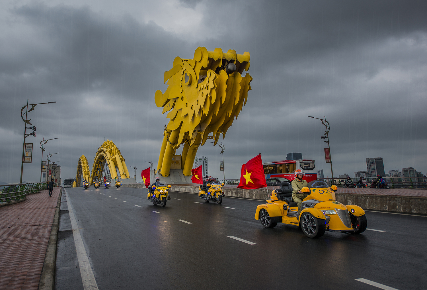 Cầu Rồng là điểm không thể không ghé thăm của du khách khi đến Đà Nẵng. Cây cầu có kiến trúc độc đáo với hình dáng rồng vươn mình bay ra biển, có thể phun nước và lửa, được thực hiện vào cuối tuần tạo điểm nhấn thu hút khách du lịch. Cầu Rồng được nhiều tạp chí chuyên ngành giao thông và du lịch đánh giá là một trong những cây cầu độc đáo nhất trên thế giới. Ảnh: Danang FantastiCity