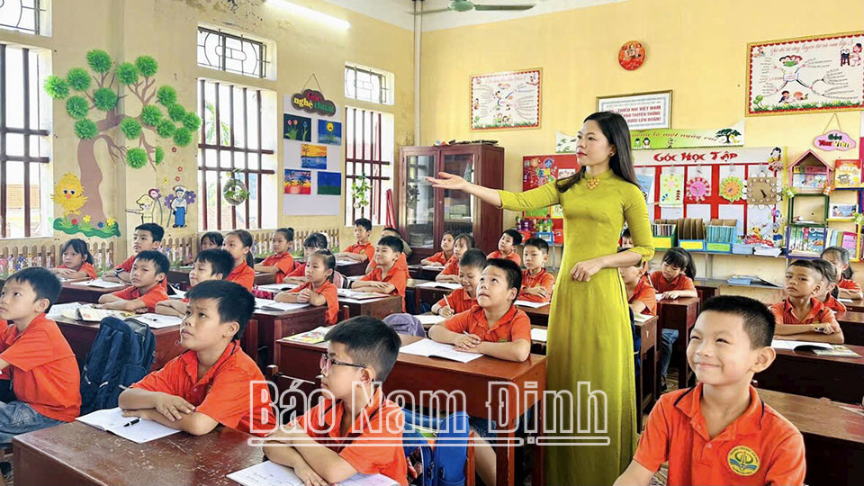 | Cô Trần Thị Hải Yến, giáo viên Trường Tiểu học Hải Anh (Hải Hậu) và học sinh trong giờ học kỹ năng sống. |