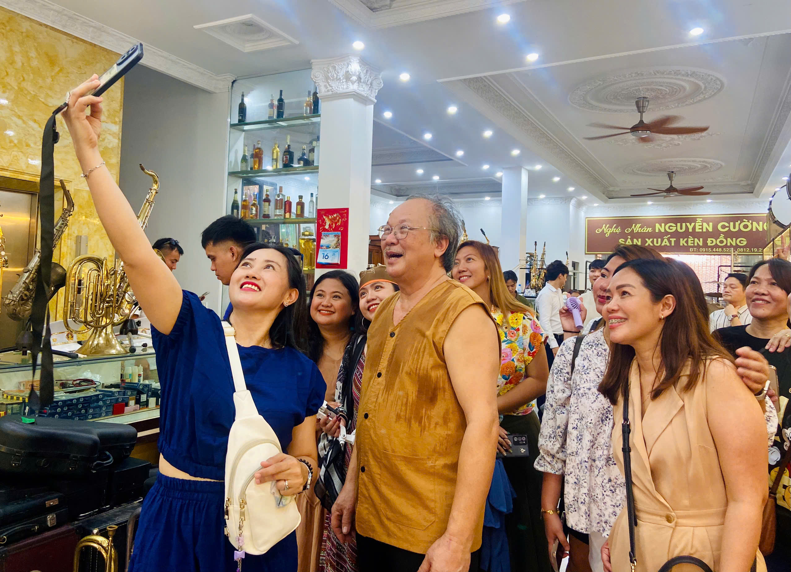 Du khách Philippines thích thú chụp ảnh cùng nghệ sĩ kèn đồng Nguyễn Văn Cường.