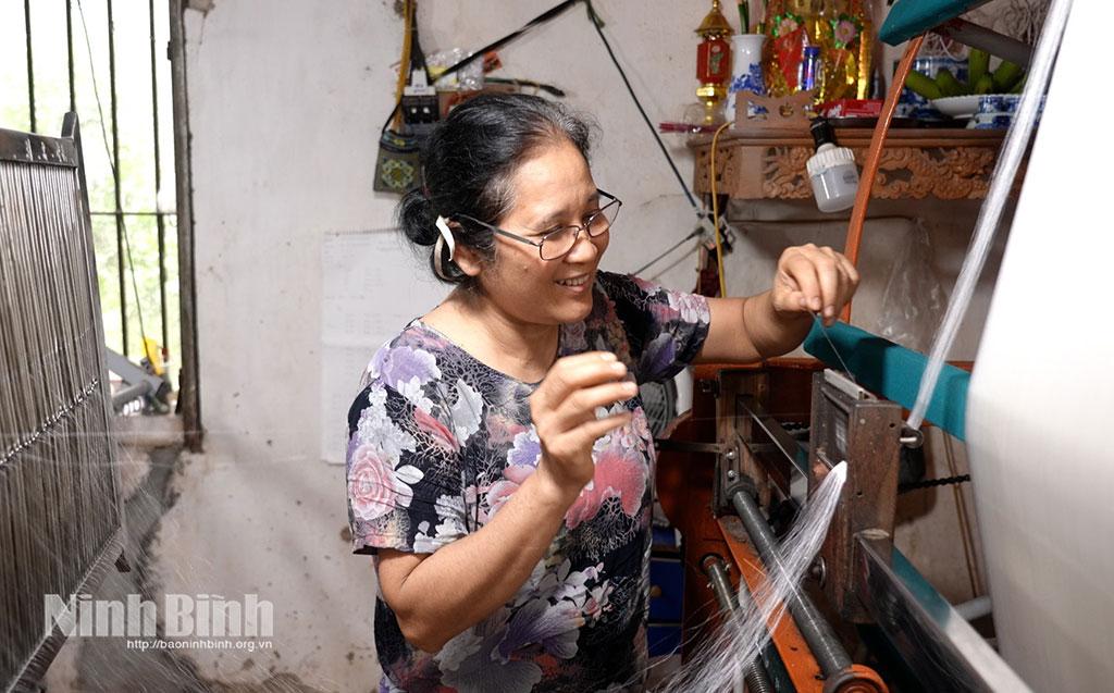 Giống như anh Nguyễn Tiến Quảng, chị Phạm Thị Ngọc Liên, Phó Chủ tịch HTX Du lịch sinh thái dệt lụa Hồng Tiến Nha Xá, chủ cơ sở dệt lụa Liên Thực có tiếng trong vùng, cũng là người tâm huyết “giữ lửa” nghề của làng, chị chia sẻ: Dù không sinh ra và lớn lên ở làng nghề nhưng cái duyên đã đưa tôi đến với nghề và gắn bó với nghề dệt lụa cũng đã gần 30 năm. Vốn sinh ra ở làng Từ Đài, xã Chuyên Ngoại (thị xã Duy Tiên), nơi nổi tiếng với nghề ươm tơ để cung cấp cho làng dệt lụa Nha Xá, nên từ nhỏ tôi đã rất thích nghề dệt lụa nơi đây. Vì thế, ngay sau khi tốt nghiệp trung học phổ thông, tôi đã xin cha mẹ đến làng Nha Xá để học nghề dệt lụa và khi thành nghề cũng là lúc tôi bén duyên với anh Nguyễn Văn Thực, nay là một trong 2 nghệ nhân của làng dệt Nha Xá. Gần 30 năm qua, tiếp nối nghề dệt lụa truyền thống của gia đình, tôi đã dành cả tình yêu, thanh xuân và đam mê cho nghề...