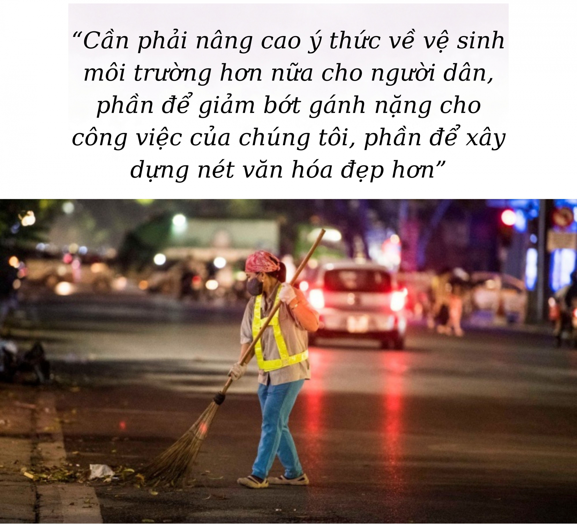 Nhọc nhằn, vất vả nhưng chị Hà, chị Huệ cũng như hàng trăm anh chị em làm nghề dọn vệ sinh môi trường chưa bao giờ nghĩ đến việc… bỏ nghề. Bởi với họ, nghề cũng là “nghiệp”, là niềm vui được thấy thành phố “sáng” lên mỗi ngày sau những giọt mồ hôi, nhát chổi. Chúng tôi hỏi các chị, có “băn khoăn” gì không trong công việc thì họ chia sẻ, chủ yếu là về ý thức bảo vệ môi trường của một bộ phận nhân dân. Nhiều người có ý thức nhai 1 cái kẹo cao su, uống 1 hộp sữa cũng tìm thùng rác để bỏ, nhưng cũng có nhiều người ăn 1 quả quýt, uống xong ấm nước chè mang... đổ toẹt ra vỉa hè, lòng đường. Họ coi đó là nơi xả rác, không ảnh hưởng đến nhà mình. Nhiều khi công nhân mới quét dọn sạch đường phố, đẩy xe rác đi được vài bước, có người đã ném bịch rác sau lưng. Khi bị nhắc nhở, một số người còn sẵng giọng, “không có rác, lấy việc đâu ra cho các bà làm”. Những lúc như thế, chúng tôi cũng thấy tủi. Vì vậy, mong muốn của anh chị em lao công là, “cần phải nâng cao ý thức vệ sinh môi trường hơn nữa cho người dân, phần để giảm bớt gánh nặng cho công việc của chúng tôi, phần để xây dựng nét văn hóa đẹp hơn”.