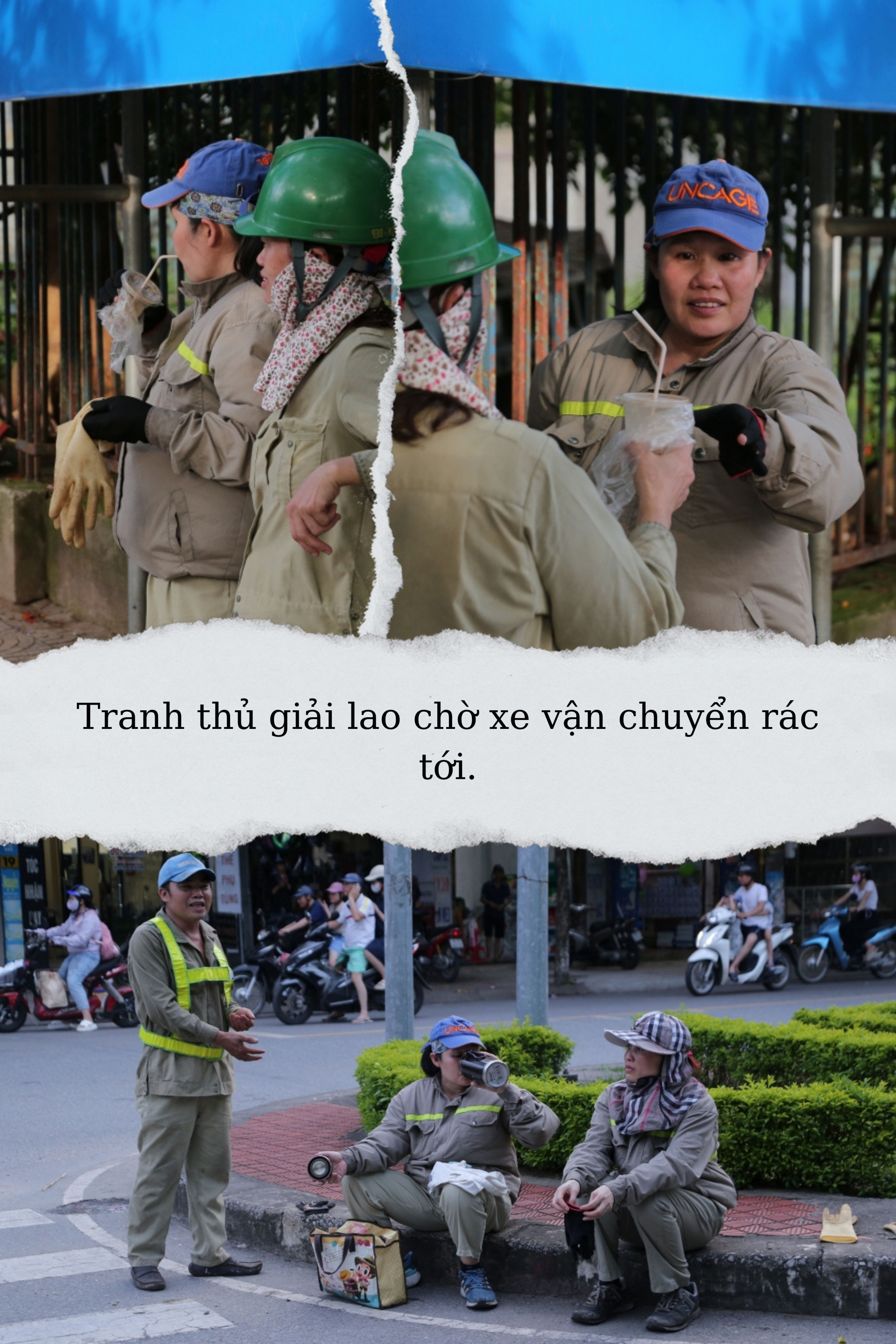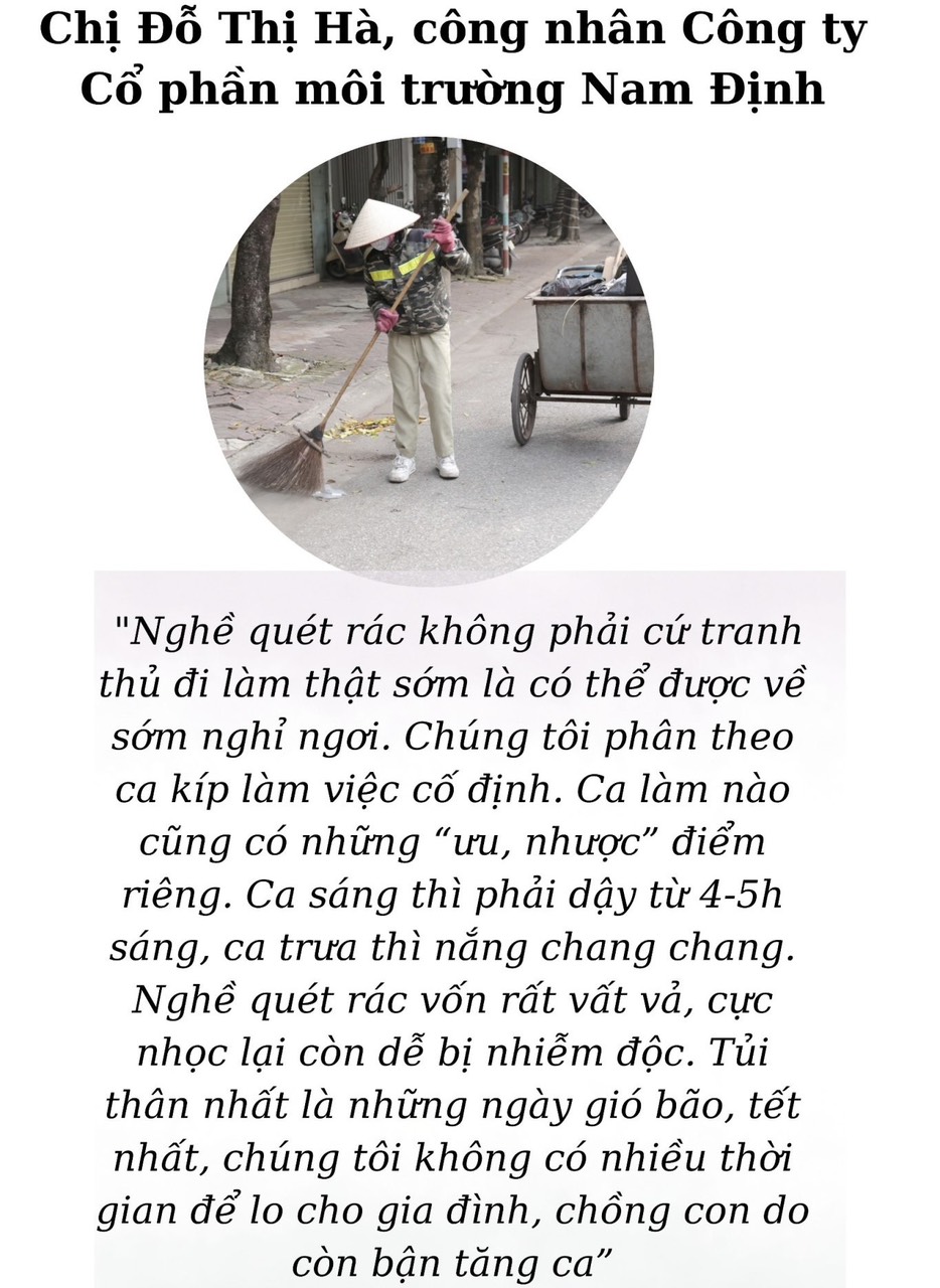 Thấm những giọt mồ hôi trên khuôn mặt khắc khổ, đen sạm vì nắng mưa, chị Hà tâm sự: "Nghề quét rác không phải cứ tranh thủ đi làm thật sớm là có thể được về sớm nghỉ ngơi. Chúng tôi phân theo ca kíp làm việc cố định. Ca làm nào cũng có những ưu, nhược điểm riêng. Ca sáng thì phải dậy từ 4-5 giờ, ca trưa thì nắng chang chang. Nghề quét rác vốn rất vất vả, cực nhọc lại dễ bị nhiễm độc. Tủi thân nhất là những ngày gió bão, tết nhất, chúng tôi không có nhiều thời gian để lo cho gia đình, chồng con do còn bận tăng ca”. Theo quy định với công nhân quét rác, họ làm việc theo ca, hầu như không có ngày nghỉ, đặc biệt trong những ngày lễ, tết, lượng rác thải lại càng nhiều nên công việc càng vất vả hơn.