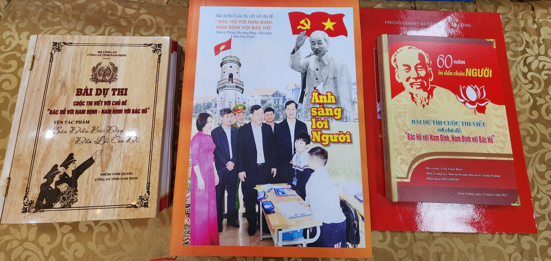 | Các tác phẩm dự thi của Nhóm Vinh quang (Công an tỉnh), Phòng Xây dựng Đảng - Nội chính (Báo Nam Định), Trần Xuân Bách (Ban Tuyên giáo Huyện ủy Xuân Trường) cũng được dày công đầu tư nghiên cứu, in ấn trên chất liệu giấy đẹp. |