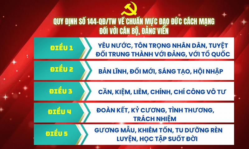 Đại hội XIII của Đảng xác định đưa công tác cán bộ thành một mặt độc lập hợp thành tổng thể 5 mặt của công tác Xây dựng Đảng là: Chính trị, tư tưởng, đạo đức, tổ chức và cán bộ. Trên tinh thần đó, ngày 9/5/2024, Bộ Chính trị đã ban hành Quy định số 144-QĐ/TW về chuẩn mực đạo đức cách mạng của cán bộ, đảng viên trong giai đoạn mới, tiếp tục khẳng định “cán bộ là gốc của mọi công việc”. Đây là Quy định có tính hệ thống, khái quát, cập nhật và góp phần đồng bộ với các quy định về chuẩn mực đạo đức cách mạng của cán bộ, đảng viên; có tính liên thông với các quy định về những điều đảng viên không được làm, về nêu gương của Đảng; là sự tiếp nối tư tưởng Hồ Chí Minh về giáo dục đạo đức cách mạng và là bước cụ thể hóa nhiệm vụ về xây dựng chuẩn mực đạo đức cách mạng mà Đại hội XIII của Đảng đề ra.