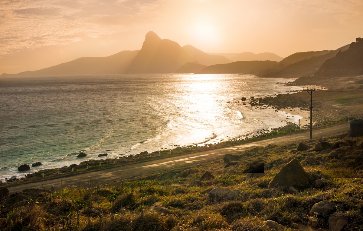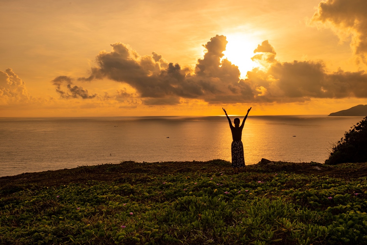 Khi mặt trời bắt đầu lặn dần cũng là lúc màu ráng chiều buông xuống “hai mái đầu” của đỉnh Tình Yêu. Trải dài từ trên cao xuống thấp, sắc cam óng cứ sáng rồi đậm dần, loang thành một màu hồng phớt nhẹ trên mặt biển. Bầu trời rực rỡ điểm xuyết những vầng mây, mặt trời tròn vạnh đỏ âu như lòng đỏ trứng.