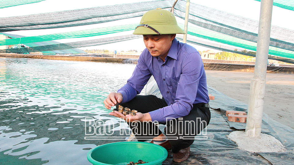 | Anh Nguyễn Minh Trưởng, Hợp tác xã Nông nghiệp và Nuôi trồng chế biến thủy hải sản An Hòa Hải Hậu, xã Hải Đông (Hải Hậu) kiểm tra ốc hương trước khi xuất bán. |