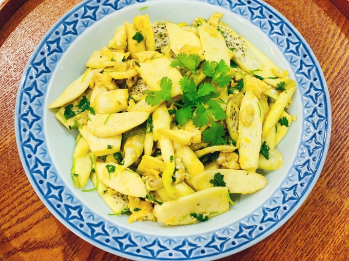 Các thành phần để xào cùng món niễng gồm trứng gà, rau mùi thơm, hành khô... Niễng non sẽ có ruột trắng, còn niễng để già sẽ xuất hiện các đốm đen (hình). Ảnh: Phương Thảo