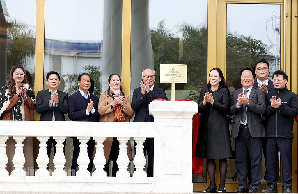 Các đại biểu thực hiện gắn biển đồng "Du lịch xanh VITA GREEN" cho Nhà hàng Thanh Nga Luxury - Ninh Bình.