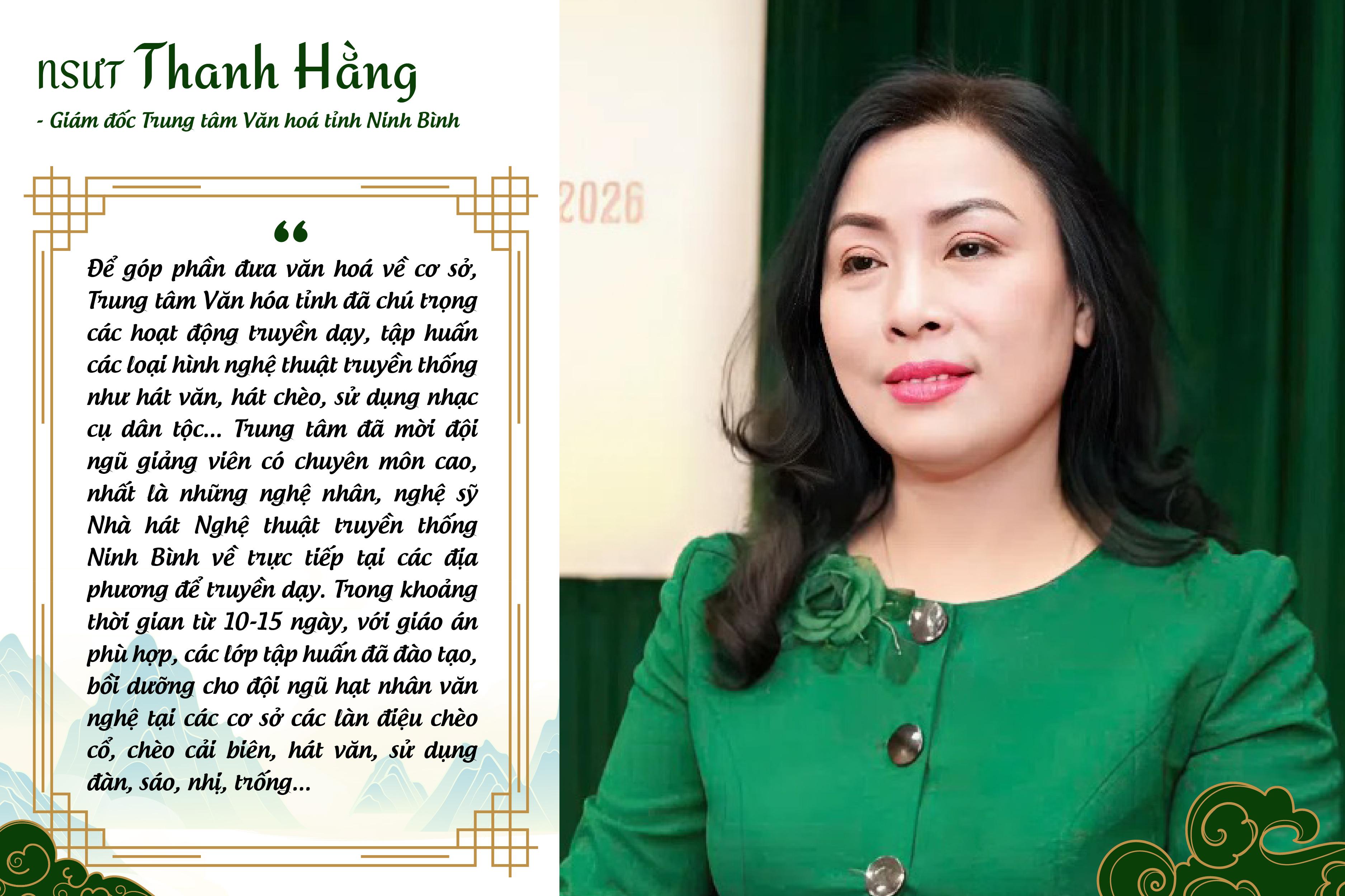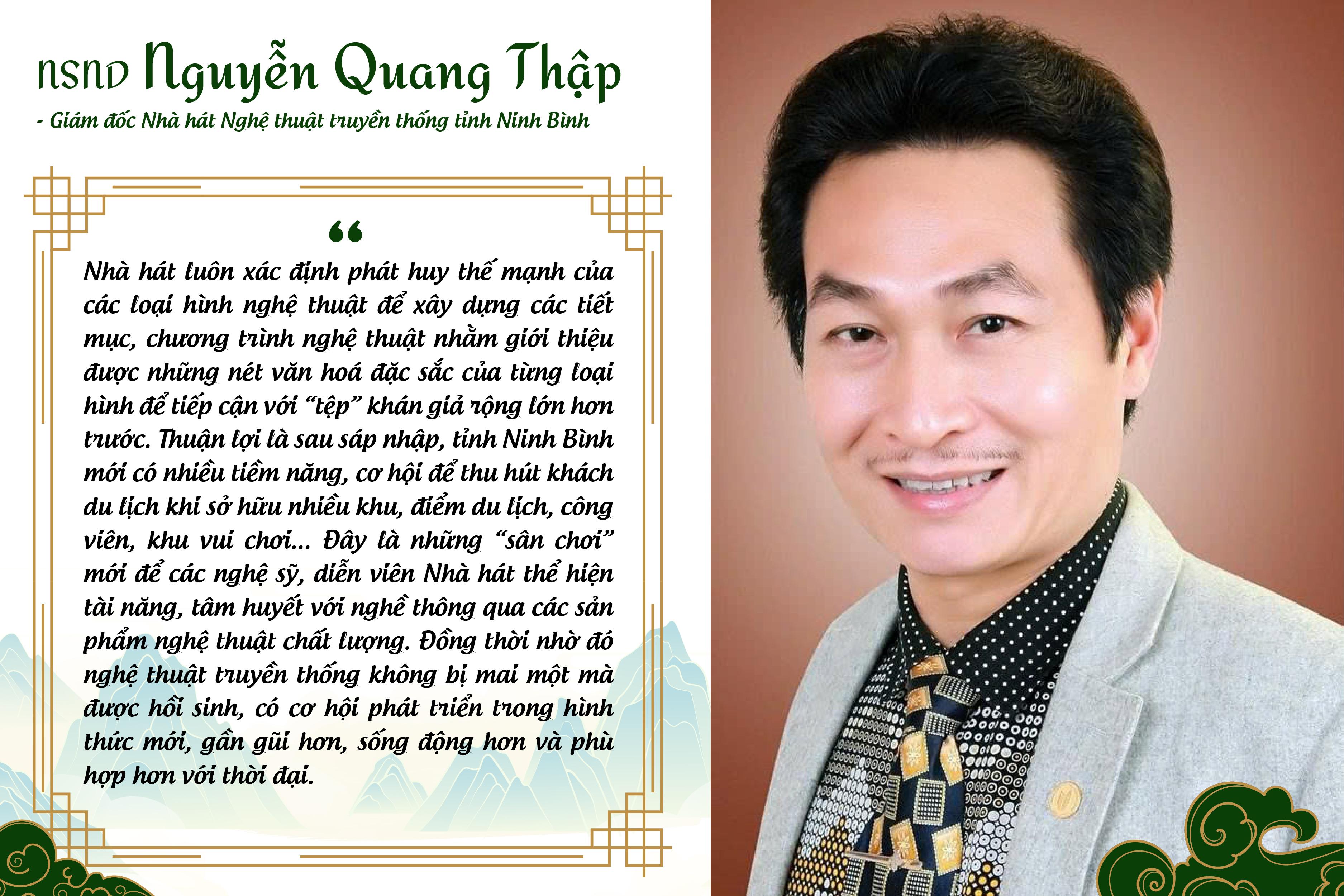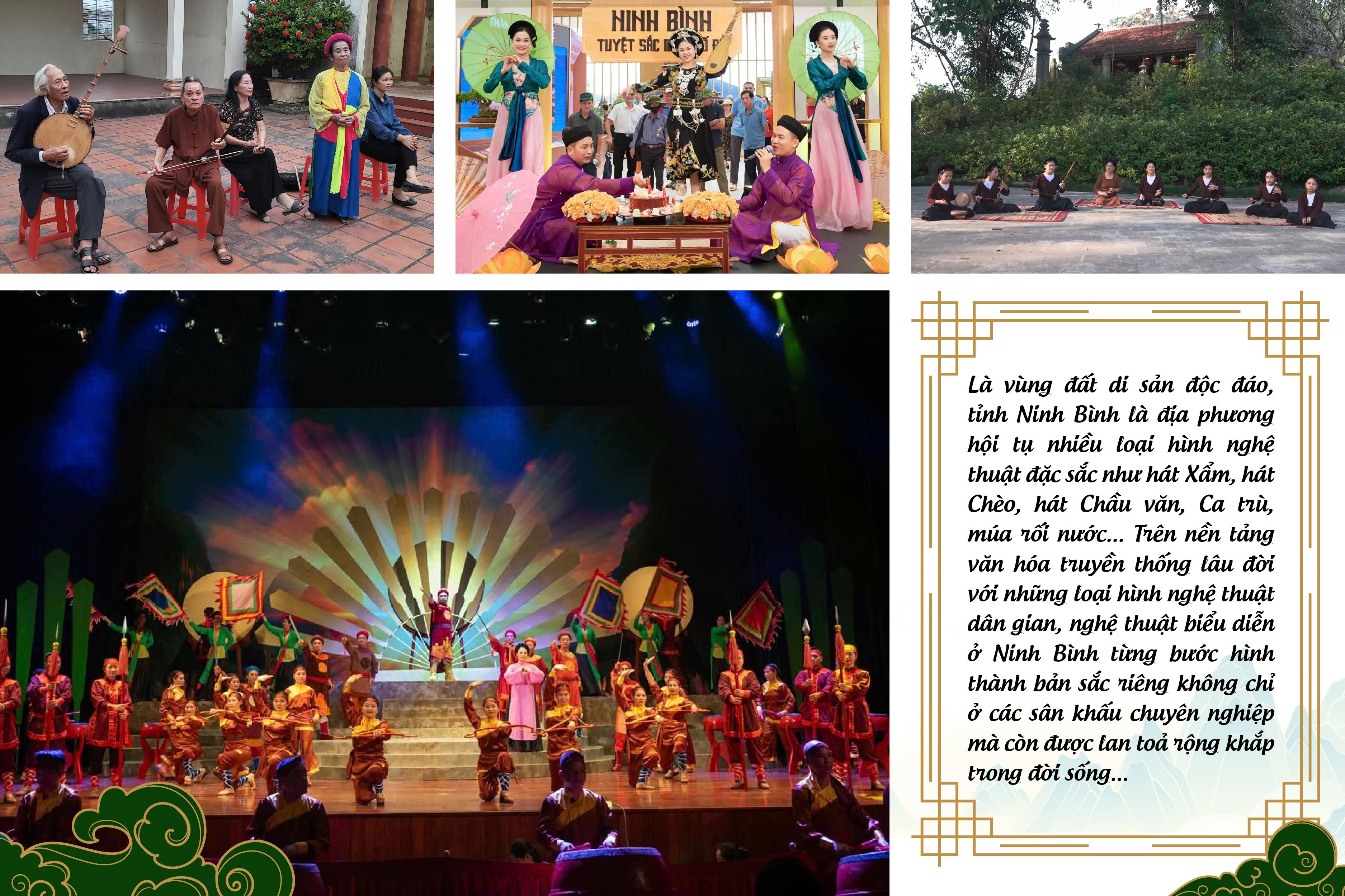 Nhà hát Nghệ thuật truyền thống tỉnh Ninh Bình được hợp nhất đã hội tụ được nhiều loại hình nghệ thuật đặc sắc. Do đó, lĩnh vực nghệ thuật biểu diễn chuyên nghiệp được kỳ vọng sẽ tạo sức bật mới. Đặc biệt, tỉnh luôn quan tâm và tiếp tục đầu tư có trọng điểm cho các loại hình biểu diễn có giá trị văn hóa đặc sắc, ứng dụng công nghệ số vào dàn dựng, biểu diễn và công tác truyền thông; mở rộng hợp tác trong và ngoài nước để giới thiệu văn hoá nghệ thuật Ninh Bình ra thế giới; đồng thời xây dựng cơ chế đãi ngộ, hỗ trợ đội ngũ nghệ sĩ, nghệ nhân, bảo tồn và phát triển di sản nghệ thuật truyền thống gắn với phát triển du lịch bền vững.