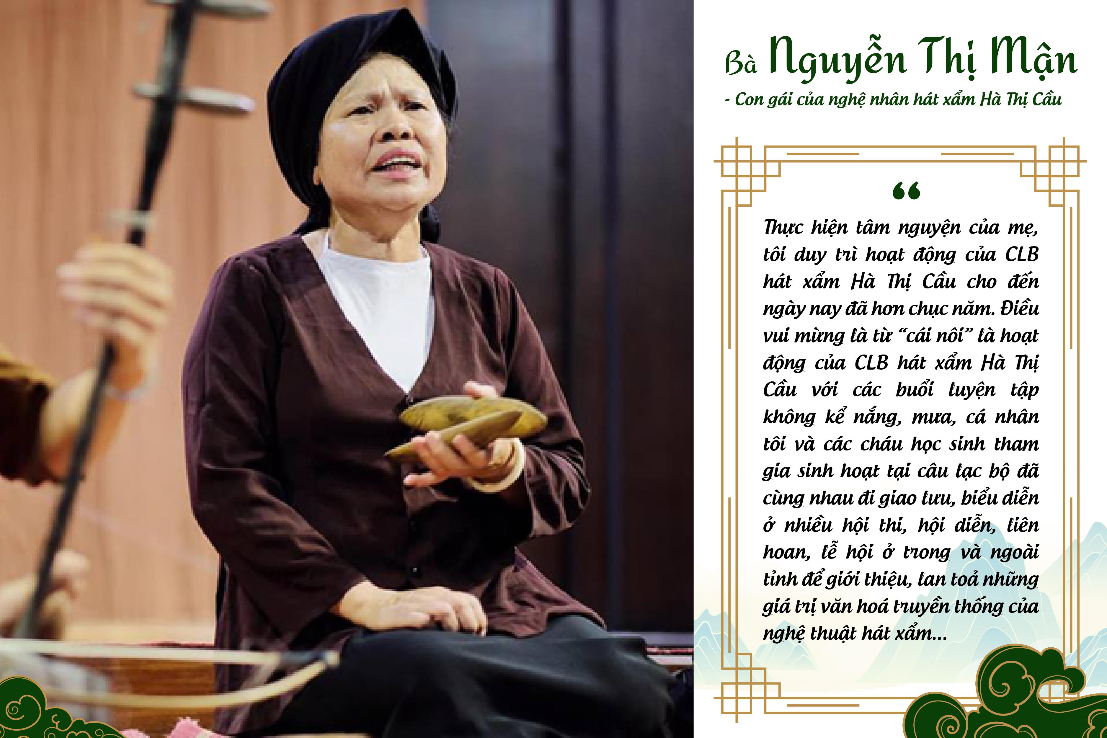 Những năm qua, ngôi nhà nhỏ ở thôn Quảng Phú, xã Yên Từ luôn rộn rã những lời hát xẩm khi bà Nguyễn Thị Mận, con gái của nghệ nhân hát xẩm Hà Thị Cầu, đã tổ chức truyền dạy miễn phí cho các nghệ sỹ không chuyên và các em học sinh trên địa bàn.