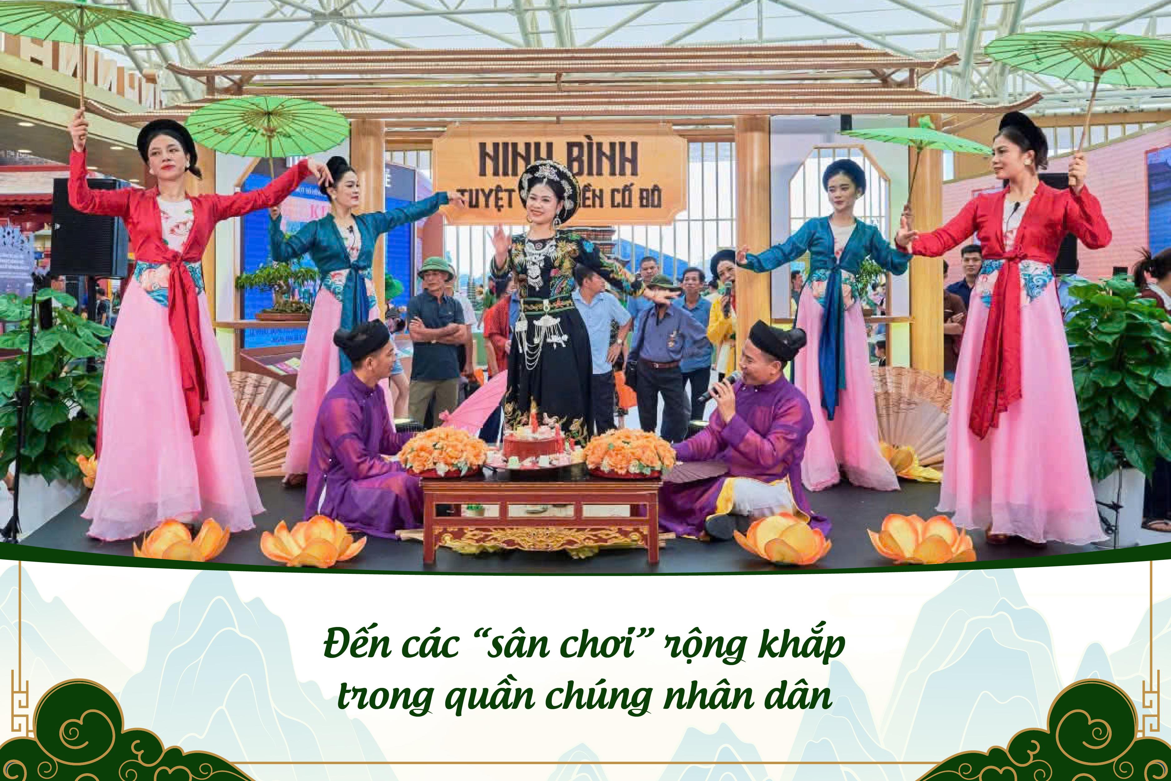 Để lan toả các loại hình nghệ thuật truyền thống, không chỉ là những buổi biểu diễn ở các sân khấu lớn phục vụ các sự kiện chính trị của tỉnh, Nhà hát đã kết hợp giữa việc tổ chức biểu diễn các chương trình nghệ thuật truyền thống gắn với du lịch. Thời gian qua, Nhà hát Nhà hát Nghệ thuật truyền thống Ninh Bình đã tổ chức biểu diễn phục vụ du khách tại Khu Di tích quốc gia đặc biệt Cố đô Hoa Lư, Phố cổ Hoa Lư, bến thuyền Tam Cốc. Những làn điệu chèo mượt mà, các trò múa rối nước, hát Xẩm… đã được nhiều khách du lịch, nhất là khách du lịch quốc tế đón nhận.