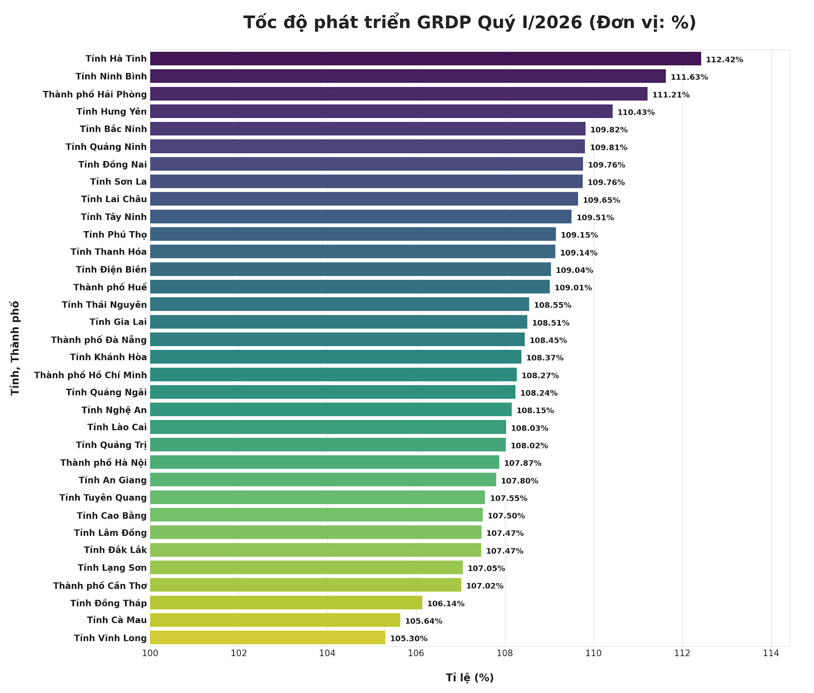 Theo báo cáo của Thống kê tỉnh, GRDP quý I năm 2026 của tỉnh ước đạt 76.665 tỷ đồng. Xét theo khu vực kinh tế, khu vực công nghiệp và xây dựng tiếp tục giữ vai trò động lực dẫn dắt tăng trưởng với mức tăng 16,19%, đóng góp 7,35 điểm phần trăm vào mức tăng chung; Khu vực dịch vụ đạt mức tăng 10,35%, đóng góp 3,61 điểm phần trăm; Khu vực nông, lâm nghiệp và thủy sản tăng 3,27%, đóng góp 0,38 điểm phần trăm; Thuế sản phẩm trừ trợ cấp sản phẩm tăng 3,55%, đóng góp 0,29 điểm phần trăm.