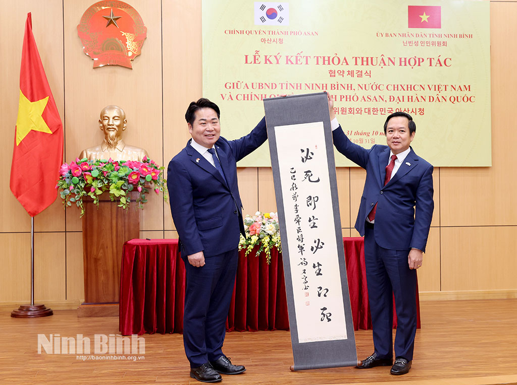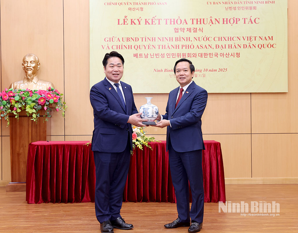 Kết thúc Hội đàm, UBND tỉnh Ninh Bình và Chính quyền thành phố Asan đã cùng ký kết 2 Thoả thuận hợp tác: Thỏa thuận hợp tác giữa UBND tỉnh Ninh Bình và Chính quyền thành phố Asan; Thỏa thuận hợp tác về phái cử và tiếp nhận lao động làm việc thời vụ tại Hàn Quốc giữa UBND tỉnh Ninh Bình và Chính quyền thành phố Asan.