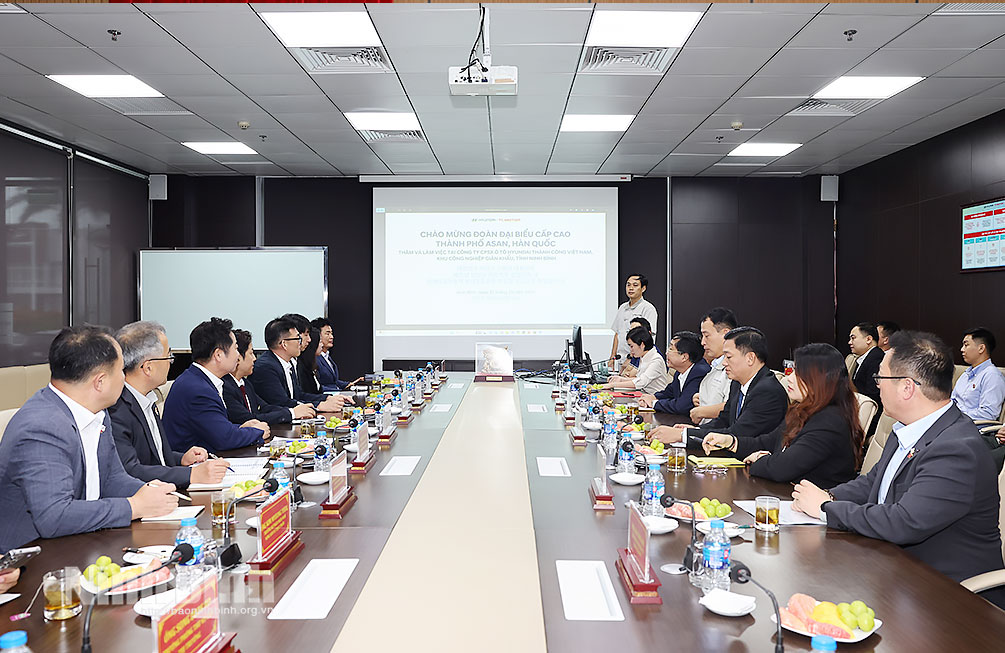 Đoàn đại biểu cấp cao thành phố Asan cùng đại diện Công ty Cổ phần sản xuất ô tô Hyundai Thành Công Việt Nam cũng đã trao đổi, làm rõ hơn hoạt động sản xuất, kinh doanh, định hướng phát triển của doanh nghiệp, những ưu đãi của tỉnh Ninh Bình dành cho Công ty khi đầu tư sản xuất tại tỉnh. Đoàn đại biểu thành phố Asan bày tỏ tự hào khi Công ty Cổ phần sản xuất ô tô Hyundai Thành Công Việt Nam đã trở thành hình mẫu của doanh nghiệp Hàn Quốc đầu tư tại Việt Nam và tỉnh Ninh Bình. Đồng thời mong muốn tỉnh Ninh Bình sẽ tiếp tục tạo điều kiện để các doanh nghiệp của thành phố Asan đến tìm hiểu và đầu tư trong thời gian tới.