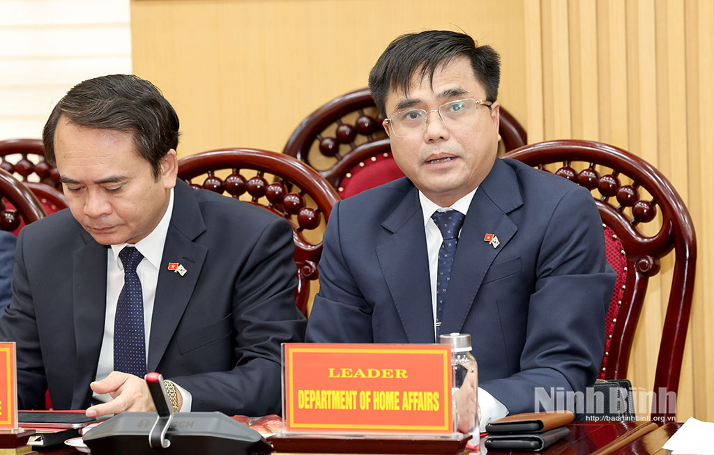 Đồng chí Chủ tịch UBND tỉnh Phạm Quang Ngọc đã giới thiệu với Đoàn về truyền thống lịch sử văn hóa, tiềm năng, thế mạnh trong phát triển kinh tế - xã hội của tỉnh Ninh Bình mới sau hợp nhất.