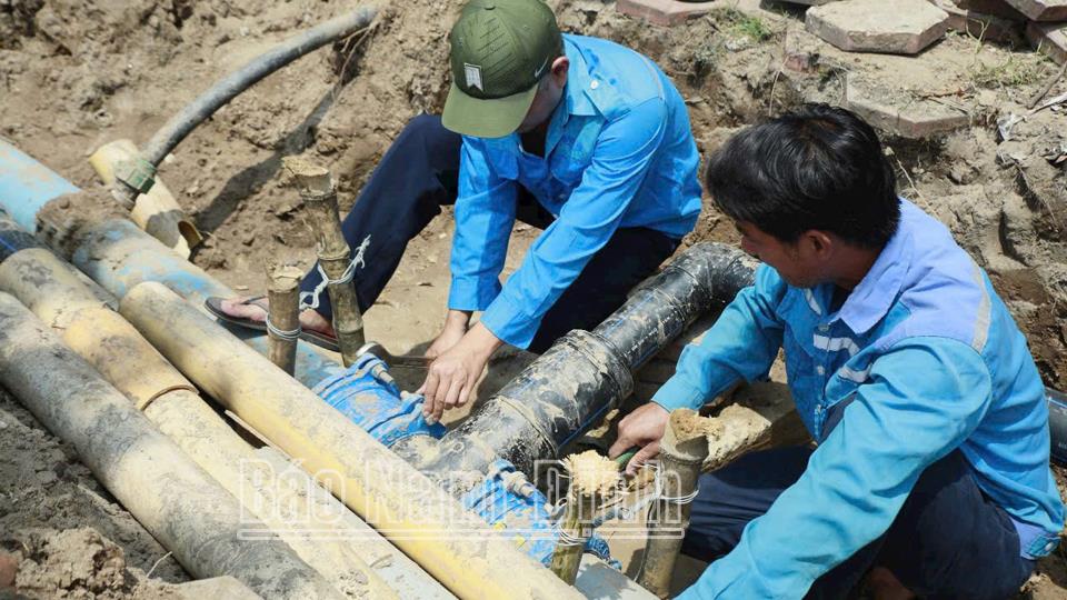 | Công nhân Công ty cổ phần cấp nước Nam Định kiểm tra, sửa chữa hệ thống nước đảm bảo sinh hoạt cho người dân vùng ngập. |