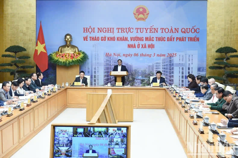 Chiều 6/3, tại Trụ sở Chính phủ, Thủ tướng Phạm Minh Chính chủ trì Hội nghị trực tuyến toàn quốc về tháo gỡ khó khăn, vướng mắc thúc đẩy nhà ở xã hội. Cùng dự có Phó Thủ tướng Chính phủ Hồ Đức Phớc; lãnh đạo các bộ, ngành Trung ương, doanh nghiệp xây dựng. Phó Thủ tướng Trần Hồng Hà dự tại điểm cầu thành phố Cần Thơ.