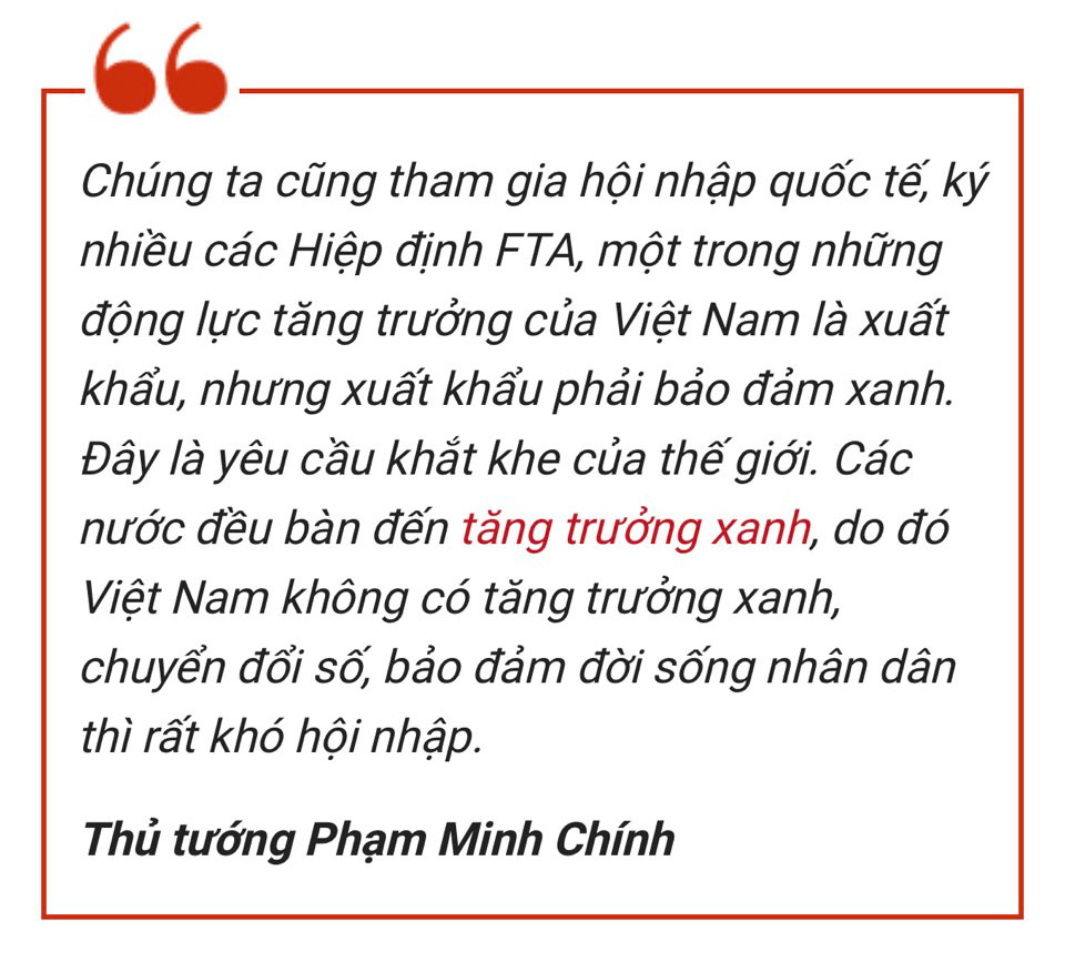 Thủ tướng nêu rõ, chúng ta cũng tham gia hội nhập quốc tế, ký nhiều các Hiệp định FTA, một trong những động lực tăng trưởng của Việt Nam là xuất khẩu, nhưng xuất khẩu phải bảo đảm xanh. Đây là yêu cầu khắt khe của thế giới. Các nước đều bàn đến tăng trưởng xanh, do đó Việt Nam không có tăng trưởng xanh, chuyển đổi số, bảo đảm đời sống nhân dân thì rất khó hội nhập. Do đó, chúng ta phải có hành động đi cùng xu thế của thế giới, không thể phát triển mà không tranh thủ xu thế.