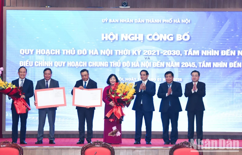 Tại hội nghị, Thủ tướng Phạm Minh Chính đã trao Quyết định số 1569/QĐ-TTg của Thủ tướng Chính phủ phê duyệt Quy hoạch Thủ đô Hà Nội và Quyết định số 1668/QĐ-TTg của Thủ tướng Chính phủ phê duyệt Điều chỉnh Quy hoạch chung Thủ đô Hà Nội cho lãnh đạo thành phố Hà Nội.