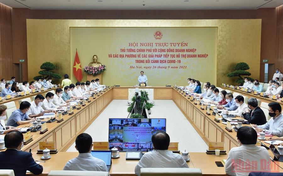 Sáng 26/9, tại Trụ sở Chính phủ, Thường trực Chính phủ tổ chức Hội nghị trực tuyến giữa Thủ tướng Chính phủ với cộng đồng doanh nghiệp và các địa phương về các giải pháp tiếp tục hỗ trợ doanh nghiệp trong bối cảnh dịch Covid-19. Thủ tướng Phạm Minh Chính chủ trì hội nghị.