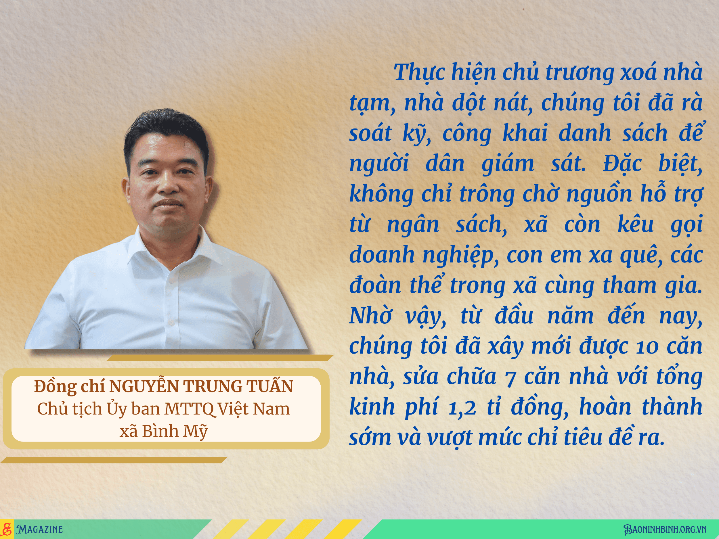Ở Bình Mỹ, điều đáng nói không chỉ là con số 17 căn nhà thay đổi diện mạo, mà còn là cách chính quyền địa phương "biến" chương trình xoá nhà tạm, nhà dột nát thành phong trào, huy động Hội Phụ nữ, Đoàn thanh niên, Cựu chiến binh cùng chung sức. Bà Nguyễn Thị Thanh Thùy, Phó Chủ tịch Ủy ban MTTQ Việt Nam xã, Chủ tịch Hội Nông dân xã chia sẻ: Khi các hộ xây nhà, chúng tôi vận động các đoàn thể hỗ trợ công lao động, đoàn thanh niên giúp dọn dẹp khuôn viên, phụ nữ hỗ trợ trang trí, vệ sinh. Kết quả, ngôi nhà mới không chỉ khang trang mà cả cảnh quan xung quanh cũng sáng, xanh, sạch, đẹp hơn.