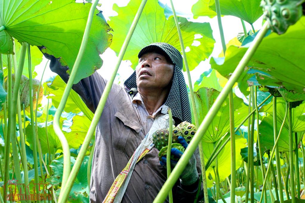 Rẽ những thân sen mọc tốt cao quá đầu người, tìm những cành sen đã gần như ngã gục xuống mặt đầm, ấy là những cành có đài sen mây mẩy chín đúng vụ, chị Nguyễn Thị Liên nhanh tay hái lấy đài sen gần tầm tay. Tay kia chị thoăn thoắt bẻ lá gần đấy vừa để đánh dấu những chỗ thu hoạch rồi vừa để tránh... đi lạc giữa đầm sen rộng lớn.