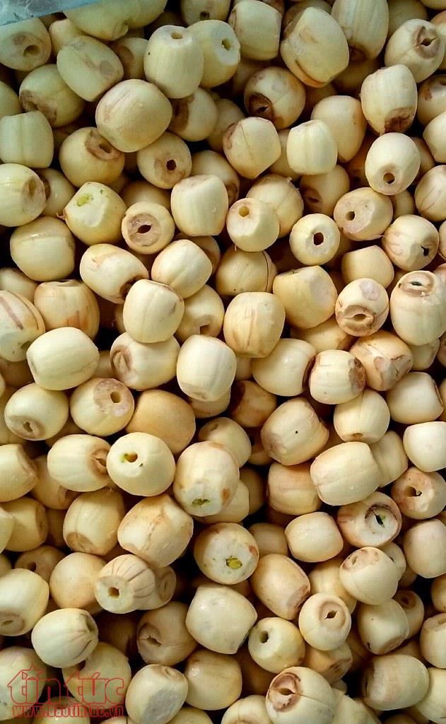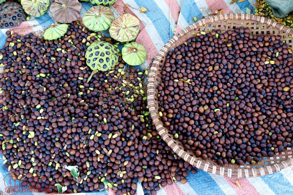 Hạt sen phơi khô, đạt tiêu chuẩn phải có phấn trắng ngoài vỏ, để khi cho vào máy chặt hạt sen mới không bị nát. Giá hạt sen dao động từ 40.000 - 50.000 đồng/kg, hạt càng to, mẩy tròn giá lại càng cao.
