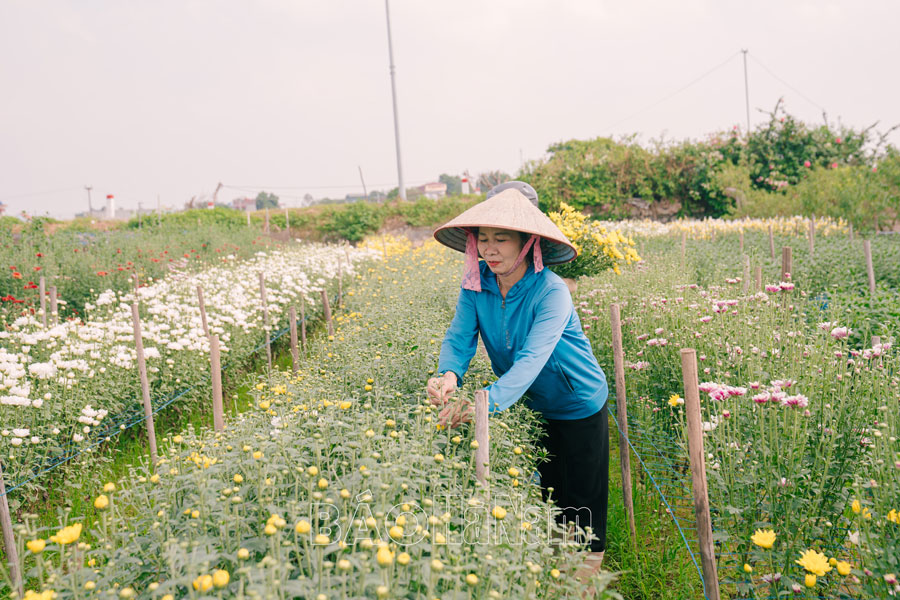 Bà Lương Thị Thủy, thôn 5, xã Phù Vân cho biết, vụ hoa Tết năm nay gia đình trồng 1.500m2 hoa cúc và hoa lấy cành các loại, xuống giống từ tháng 9. Để bảo đảm cây hoa phát triển tốt, bà thường xuyên theo dõi sát diễn biến sinh trưởng của cây hoa, tưới nước đều đặn, phun thuốc kích thích tăng trưởng và tỉa nụ nhánh để giữ cho cây hoa phát triển và nở đúng thời vụ Tết.