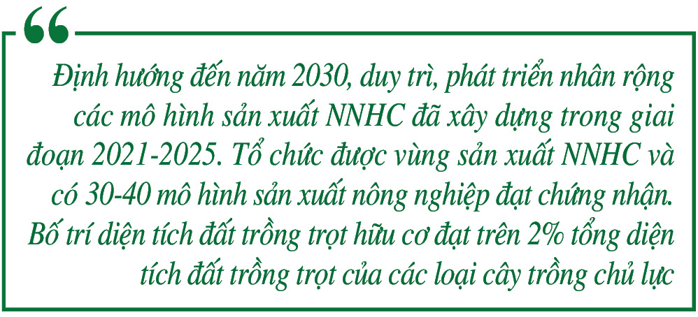 Nhằm phát triển nền tảng NNHC bền vững, UBND tỉnh đã ban hành Kế hoạch số 118/KH-UBND về phát triển NNHC giai đoạn 2021-2025, định hướng đến năm 2030. Trong đó, giai đoạn 2021-2025 các ngành chức năng xác định vùng sản xuất NNHC trên các loại cây trồng, vật nuôi, thủy sản chủ lực của tỉnh gồm: Lúa chất lượng cao, rau các loại, khoai tây, ngô, lạc, cây ăn quả các loại, cây dược liệu, nuôi dưỡng, trồng trọt trong sân và sản xuất muối. Lựa chọn xây dựng từ 15-20 mô hình sản xuất nông nghiệp đạt chứng nhận hữu cơ làm cơ sở xây dựng quy trình sản xuất NNHC có giá trị sản phẩm trên 1ha canh tác tăng 1,3-1,5 lần so với sản xuất phi hữu cơ. Định hướng đến năm 2030, duy trì, phát triển nhân rộng các mô hình sản xuất NNHC đã xây dựng trong giai đoạn 2021-2025. Tổ chức được vùng sản xuất NNHC và có 30-40 mô hình sản xuất nông nghiệp đạt chứng nhận. Bố trí diện tích đất trồng trọt hữu cơ đạt trên 2% tổng diện tích đất trồng trọt của các loại cây trồng chủ lực; tỷ lệ sản phẩm chăn nuôi hữu cơ đạt 2-3% trên tổng sản phẩm chăn nuôi; diện tích nuôi thủy sản hữu cơ đạt 3-5% tổng diện tích nuôi thủy sản; diện tích sản xuất muối hữu cơ đạt trên 50% tổng diện tích muối hiện có. Giá trị sản phẩm trên 1ha đất và nuôi trồng, sản xuất hữu cơ cao gấp 1,5-1,8 lần so với sản xuất phi hữu cơ.