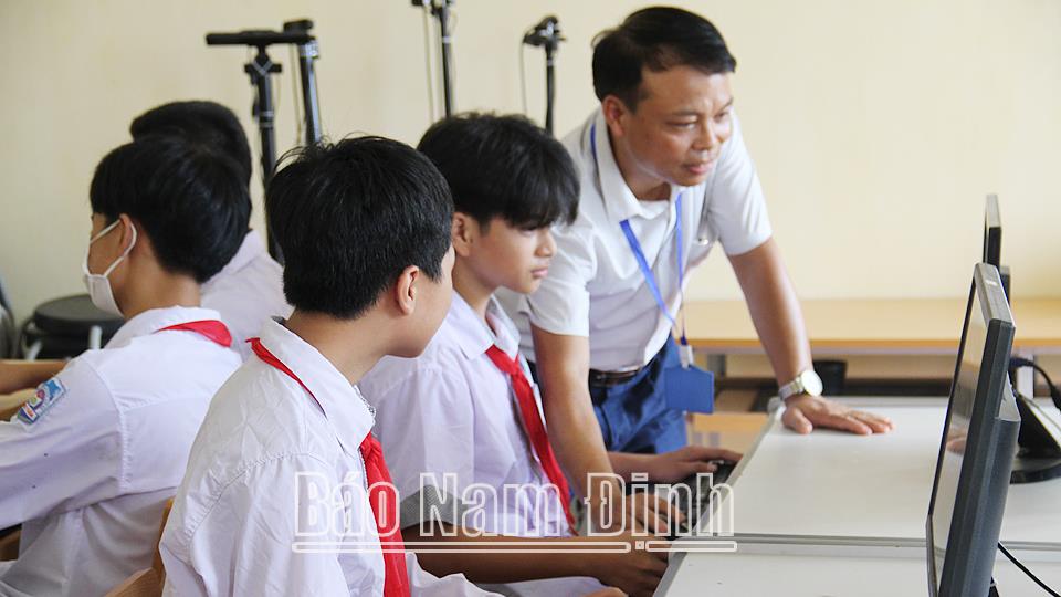 | Giáo viên trường THCS Trực Tuấn (Trực Ninh) hướng dẫn học sinh thực hành tin học ứng dụng. |