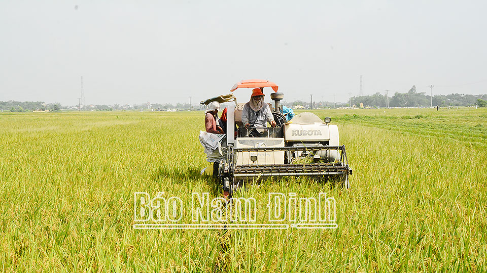 | Nông dân xã Giao Thịnh (Giao Thủy) thu hoạch lúa mùa 2022. |