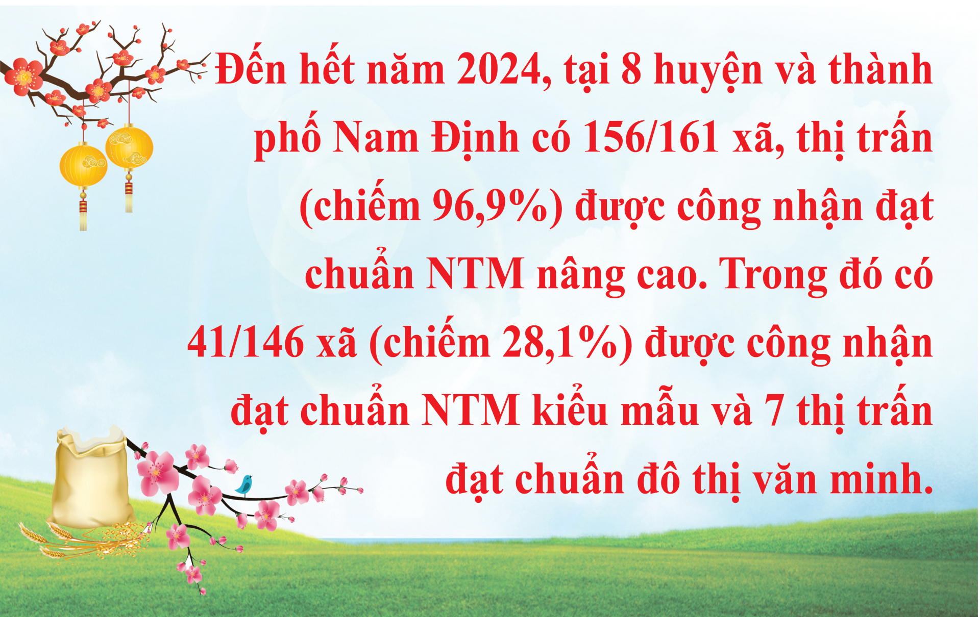 Nhờ thực hiện đồng bộ các giải pháp, sự đồng thuận, thống nhất trong toàn hệ thống chính trị, sự chung tay góp sức của nhân dân, doanh nghiệp, năm 2018 Nam Định là 1 trong 2 địa phương đầu tiên của cả nước được Thủ tướng Chính phủ quyết định công nhận đạt chuẩn NTM và hoàn thành nhiệm vụ xây dựng NTM. Chương trình xây dựng NTM về đích sớm 1,5 năm so với mục tiêu Nghị quyết Đại hội Đảng bộ tỉnh lần thứ XIX đề ra. Nhân dân phấn khởi, tin tưởng vào sự lãnh đạo, chỉ đạo của Đảng và hài lòng với kết quả xây dựng NTM. Nhờ có các nghị quyết rất quan trọng chỉ rõ quan điểm, định hướng, mục tiêu, nhiệm vụ, giải pháp, làm cơ sở để các cấp chính quyền tổ chức chỉ đạo, điều hành phát triển kinh tế - xã hội nói chung và nhiệm vụ xây dựng NTM nói riêng nên đến hết năm 2024, tại 8 huyện và thành phố Nam Định có 156/161 xã, thị trấn (chiếm 96,9%) được công nhận đạt chuẩn NTM nâng cao. Trong đó có 41/146 xã (chiếm 28,1%) được công nhận đạt chuẩn NTM kiểu mẫu và 7 thị trấn đạt chuẩn đô thị văn minh. Ngoài huyện Giao Thuỷ được Thủ tướng Chính phủ công nhận đạt chuẩn NTM nâng cao năm 2023; các huyện Xuân Trường và Trực Ninh đang hoàn thiện hồ sơ trình các cấp có thẩm quyền xét, công nhận đạt chuẩn huyện NTM nâng cao năm 2024.