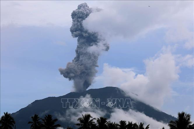 Tro bụi phun lên từ núi lửa Ibu, nhìn từ Tây Halmahera, tỉnh Bắc Maluku, Indonesia, ngày 16/1/2025. Ảnh: THX/TTXVN