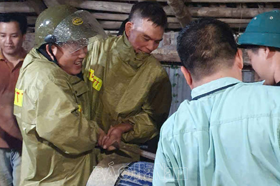 Lực lượng bảo vệ ANTT ở cơ sở giúp các hộ làng nghề kê cao máy móc thiết bị, tránh không bị ngập nước.