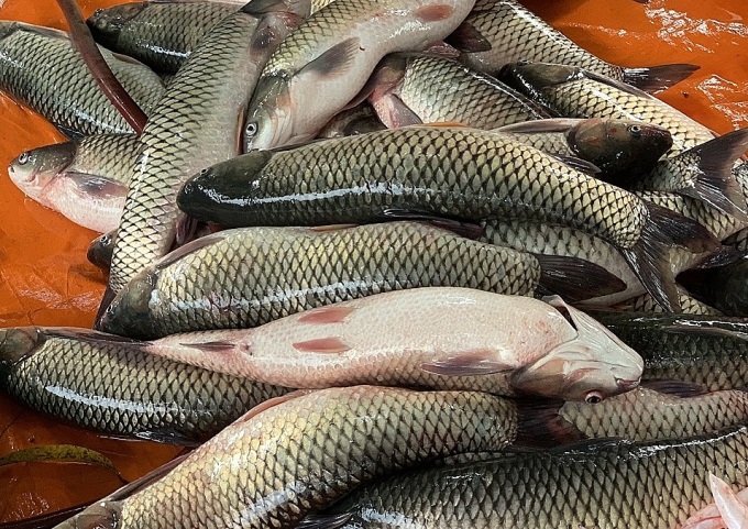 Thu hoạch cá trắm cỏ tại ao nuôi thử nghiệm ở Hà Nam. Ảnh: PM