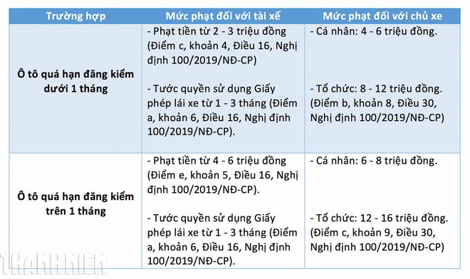 Trường hợp ô tô quá hạn đăng kiểm trên 1 tháng, mức xử phạt hành chính đối với người điều khiển xe sẽ lên đến 4 - 6 triệu đồng theo quy định tại điểm e, khoản 5, điều 16 của Nghị định 100/2019, đồng thời tước quyền sử dụng giấy phép lái xe từ 1 - 3 tháng.