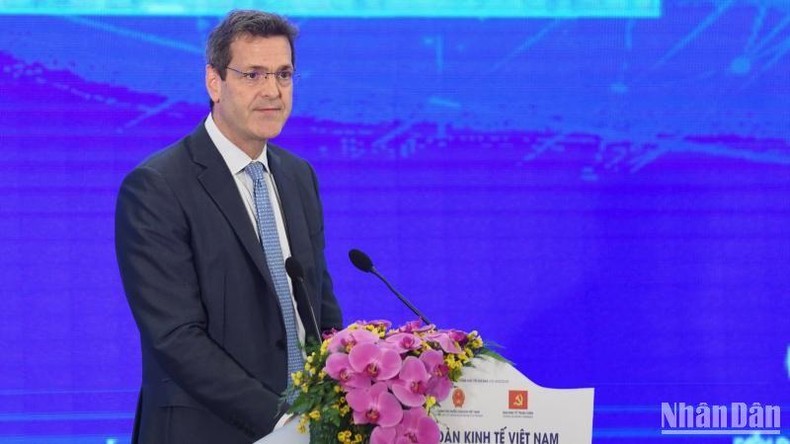 Phát biểu trực tuyến, Chuyên gia kinh tế trưởng Ngân hàng Thế giới (WB) tại Việt Nam Andrea Coppola đánh giá, Diễn đàn Kinh tế Việt Nam lần thứ 5 là cơ hội tuyệt vời để thảo luận về những thách thức do nền kinh tế toàn cầu gây ra và những tác động chính sách có thể có đối với Việt Nam nhằm giảm thiểu rủi ro kinh tế vĩ mô đồng thời thúc đẩy tăng trưởng kinh tế.