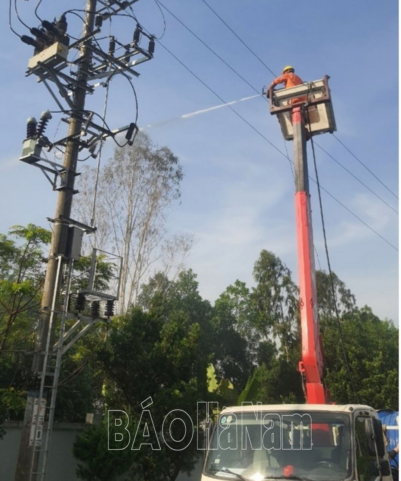 Công nhân PC Hà Nam đang vệ sinh đường dây bằng nước áp lực.