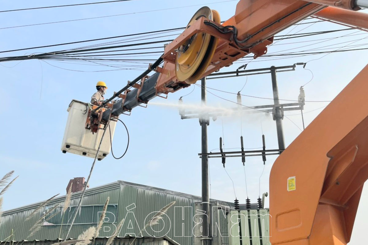 Công nhân Công ty Điện lực Hà Nam đang vệ sinh công nghiệp TBA cho khách hàng ở huyện Thanh Liêm.