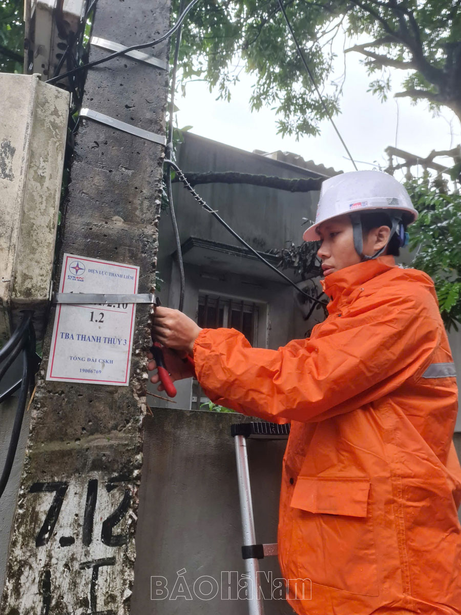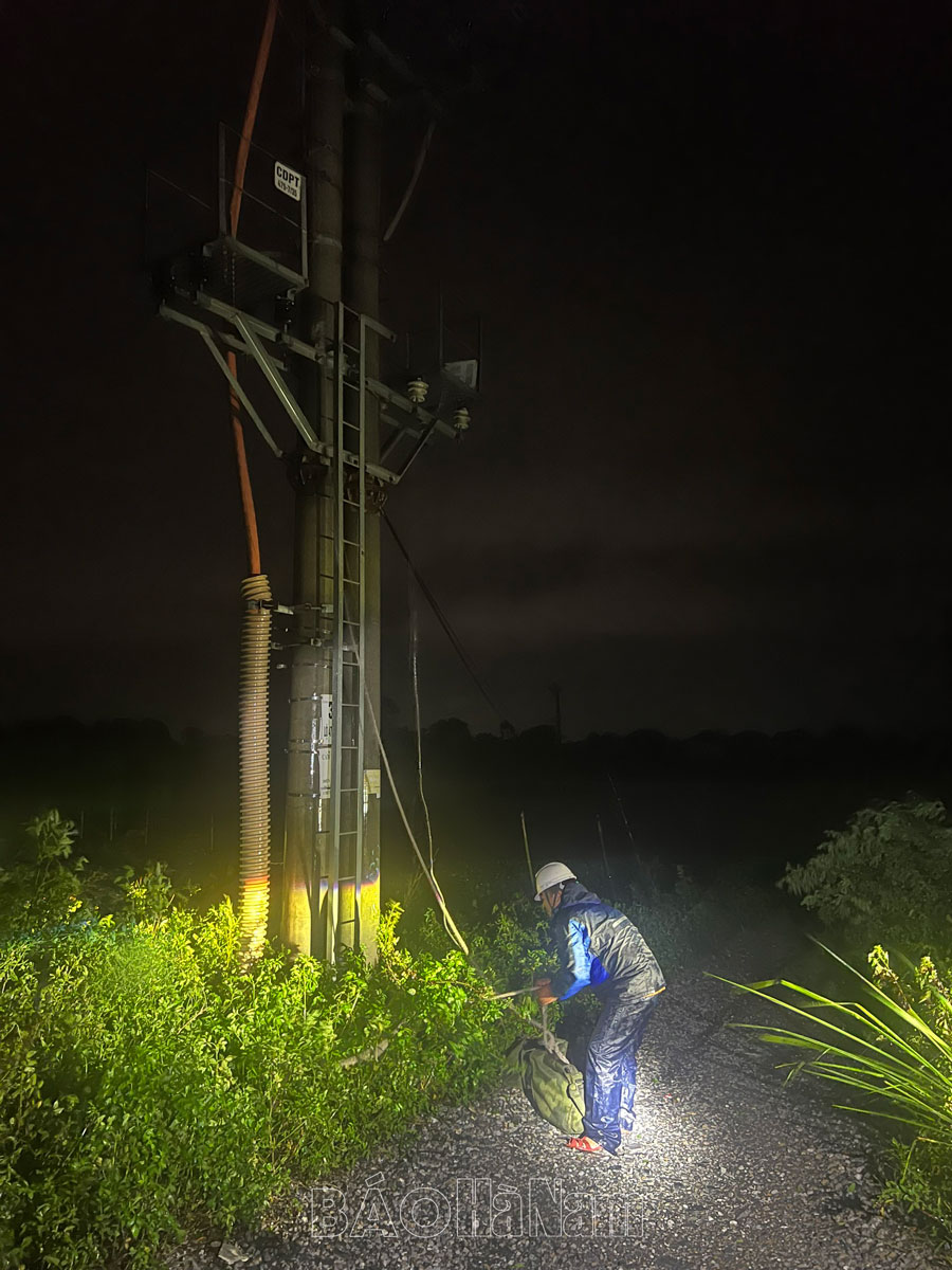 Công nhân PC Hà Nam kiểm tra lưới điện trong mùa mưa lũ.