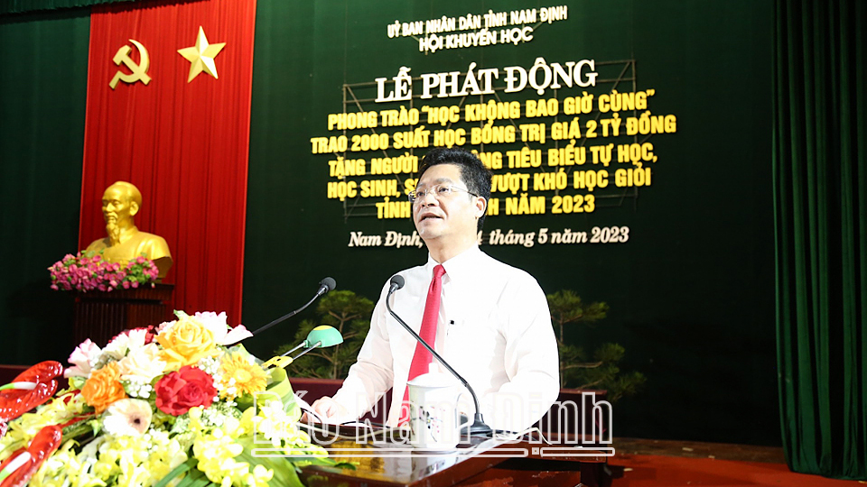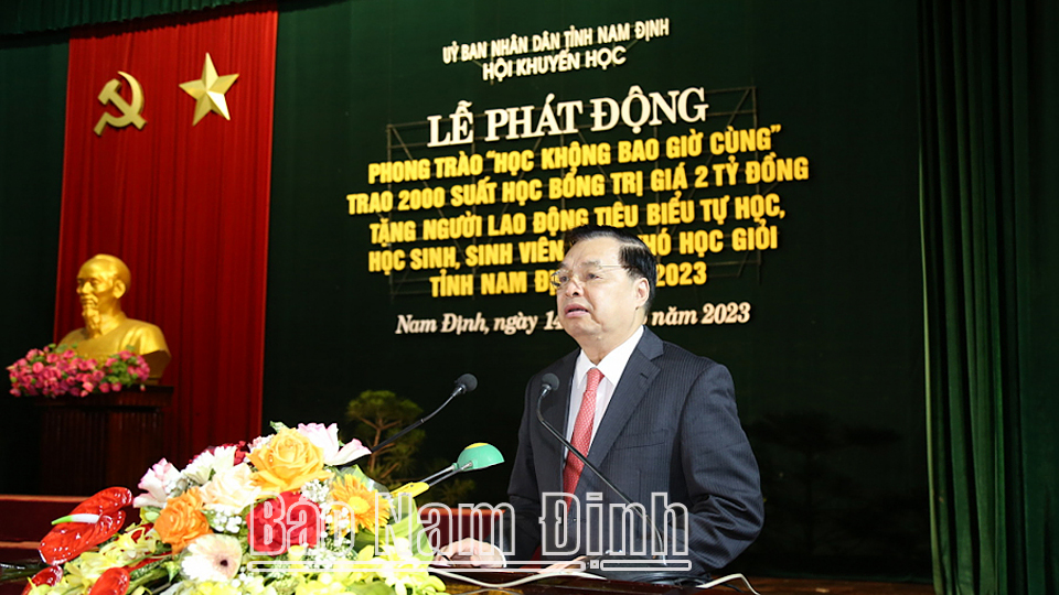 Lễ phát động và trao học bổng “Học không bao giờ cùng” do Hội Khuyến học tỉnh tổ chức trong dịp này là một trong những hoạt động ý nghĩa nhân kỷ niệm 133 năm Ngày sinh Chủ tịch Hồ Chí Minh và 60 năm Ngày Bác Hồ về thăm Đảng bộ và nhân dân tỉnh Nam Định. Đồng chí Phó Chủ tịch Thường trực UBND tỉnh biểu dương, ghi nhận những kết quả, thành tích quan trọng của Hội khuyến học tỉnh đạt được trong thời gian qua và đánh giá cao sáng kiến tổ chức trao học bổng “Học không bao giờ cùng” - học bổng có ý nghĩa nhân văn sâu sắc trong phong trào xây dựng xã hội học tập, học tập suốt đời theo Tư tưởng Hồ Chí Minh và chủ trương của Đảng, Nhà nước. Đồng chí cũng ghi nhận và đánh giá cao cấp ủy, chính quyền các cấp, các tập thể và cá nhân đã quan tâm lãnh đạo, chỉ đạo phong trào khuyến học, khuyến tài; đã hỗ trợ điều kiện vật chất, tinh thần cho các cấp Hội khuyến học thực hiện tốt nhiệm vụ rất quan trọng này và mong rằng Hội Khuyến học tỉnh sẽ tiếp tục phát huy những kết quả, thành tích đạt được, tiếp tục triển khai thực hiện các chủ trương, chính sách của Đảng và Nhà nước về đẩy mạnh công tác khuyến học, khuyến tài, xây dựng xã hội học tập giai đoạn 2021-2030 lên một tầm vóc mới. Các cấp ủy Đảng, chính quyền, MTTQ, các cơ quan, ban, ngành, đoàn thể của tỉnh tiếp tục quan tâm chăm lo hơn nữa đến công tác giáo dục và đào tạo nói chung, khuyến học, khuyến tài của tỉnh nói riêng và kêu gọi các tổ chức, cá nhân, doanh nghiệp, các nhà hảo tâm trong và ngoài tỉnh, trong nước và nước ngoài tiếp tục chung tay góp sức, tạo môi trường và các điều kiện tiếp tục ủng hộ quỹ khuyến học các cấp. Các cá nhân người lao động và các học sinh, sinh viên nhận được học bổng cần tiếp tục phấn đấu trên con đường chinh phục tri thức, lan tỏa năng lượng tích cực từ tấm gương tự học, tự rèn luyện của bản thân cho gia đình và xã hội, góp phần phát triển sự nghiệp giáo dục, phát triển kinh tế - xã hội của tỉnh và đất nước.