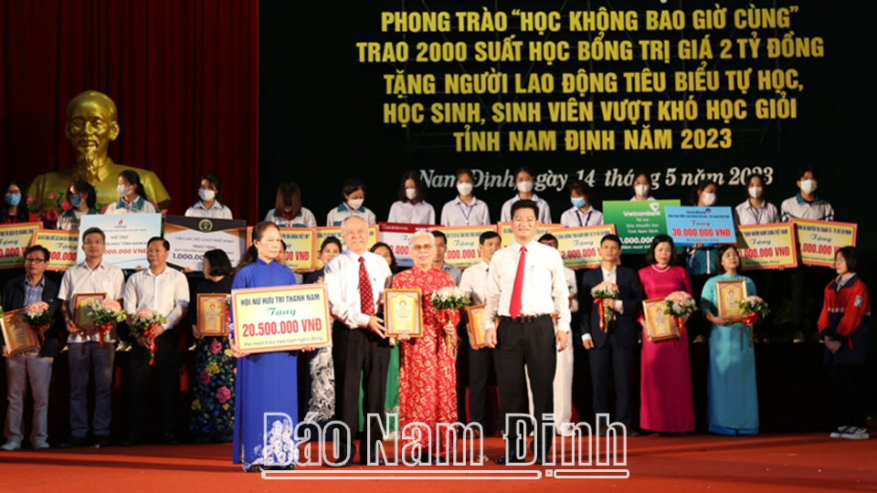 Chào mừng kỷ niệm 133 năm ngày sinh Chủ tịch Hồ Chí Minh và kỷ niệm 60 năm Ngày Bác Hồ về thăm Đảng bộ và Nhân dân tỉnh Nam Định (21-5-1963 - 21-5-2023), sáng 14-5, tại Nhà Văn hóa 3-2 tỉnh (thành phố Nam Định), Hội Khuyến học tỉnh phát động phong trào “Học không bao giờ cùng” và trao 2.000 suất học bổng trị giá 2 tỷ đồng tặng người lao động tiêu biểu tự học, học sinh, sinh viên vượt khó học giỏi năm 2023.