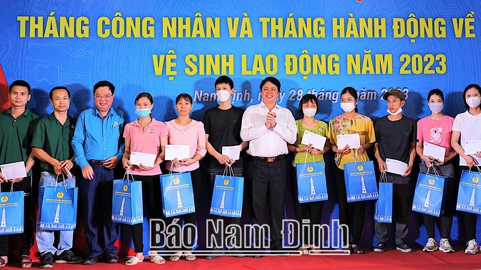 | Các đồng chí: Trần Thanh Hải, Phó Chủ tịch Thường trực Tổng LĐLĐ Việt Nam; Trần Lê Đoài, TUV, Phó Chủ tịch UBND tỉnh trao quà cho công nhân, lao động tại Lễ phát động Tháng Công nhân và Tháng hành động về an toàn vệ sinh lao động năm 2023. |