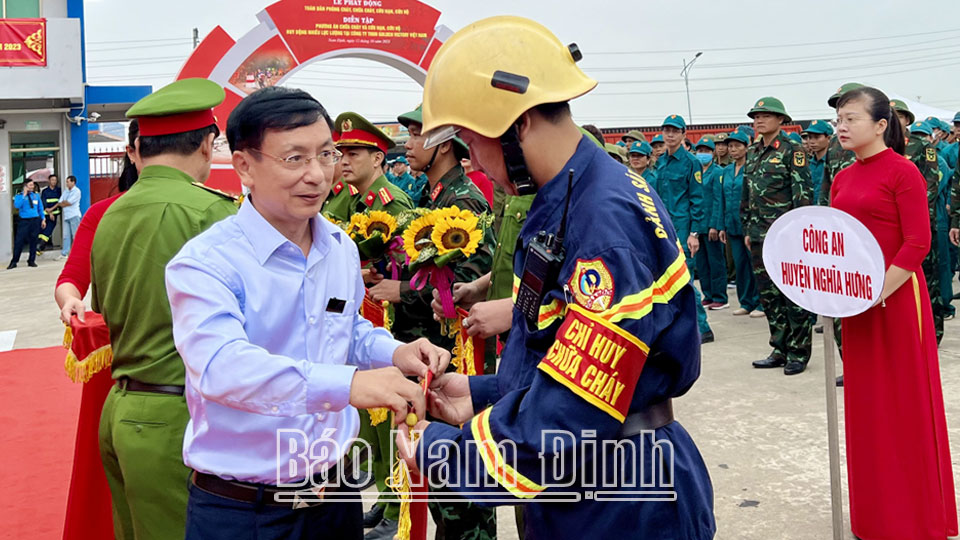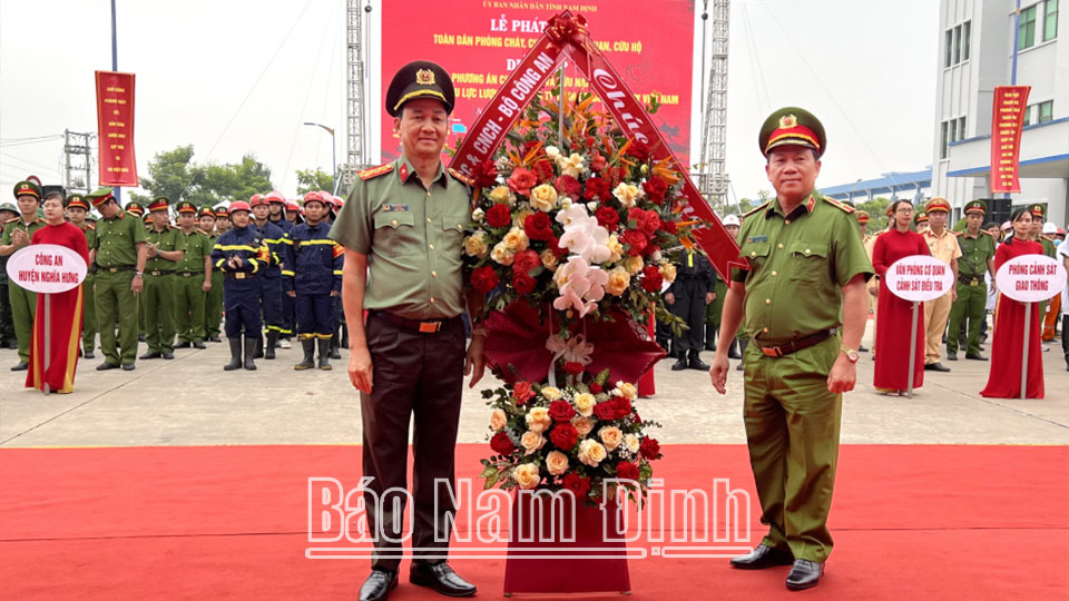 Dự lễ phát động có các đồng chí: Phạm Đình Nghị, Phó Bí thư Tỉnh ủy, Chủ tịch UBND tỉnh; Trần Anh Dũng, Ủy viên Ban TVTU, Phó Chủ tịch Thường trực UBND tỉnh, Trưởng Ban Chỉ đạo PCCC và CNCH, Trưởng Ban Chỉ đạo diễn tập phương án; các đồng chí Thiếu tướng: Huỳnh Thới An, Phó Cục trưởng Cục Cảnh sát PCCC và CNCH; Đặng Ngọc Bách, Phó Cục trưởng Cục Công tác Đảng và Công tác Chính trị (Bộ Công an); Đại tá Trần Minh Tiến, Ủy viên Ban TVTU, Giám đốc Công an tỉnh; lãnh đạo Công an các tỉnh: Hà Nam, Thái Bình; lãnh đạo các sở, ngành thành viên Ban Chỉ đạo PCCC và CNCH tỉnh; lãnh đạo huyện Nghĩa Hưng và Công ty TNHH Golden Victory Việt Nam.