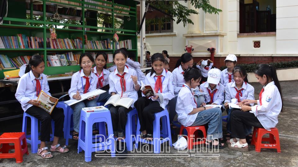 | Học sinh Trường THCS thị trấn Lâm đọc sách tại Thư viện sách lưu động (Thư viện tỉnh). |
