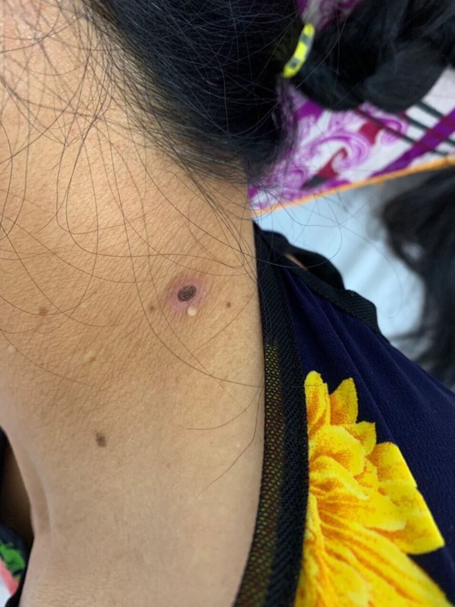 Vét loét trên cổ bệnh nhân, đặc trưng của bệnh sốt mò. Ảnh: BSCC.