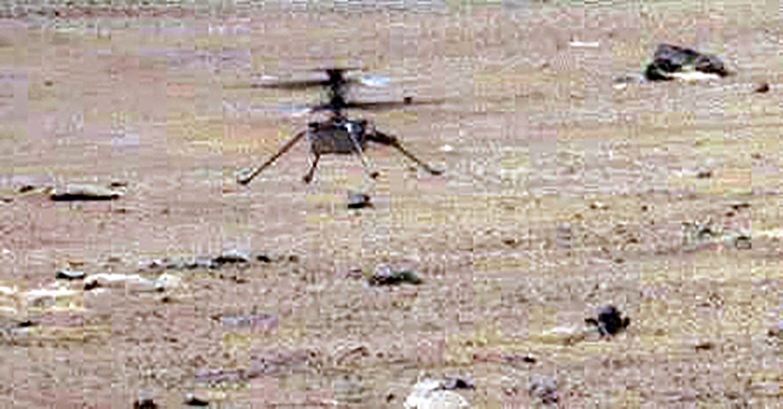 Hình ảnh trực thăng thám hiểm Sao Hỏa Ingenuity hạ cánh sau chuyến bay thứ 5, được chụp từ camera của tàu thăm dò Perseverance, ngày 5/4/2021. Ảnh minh hoạ: AFP/TTXVN