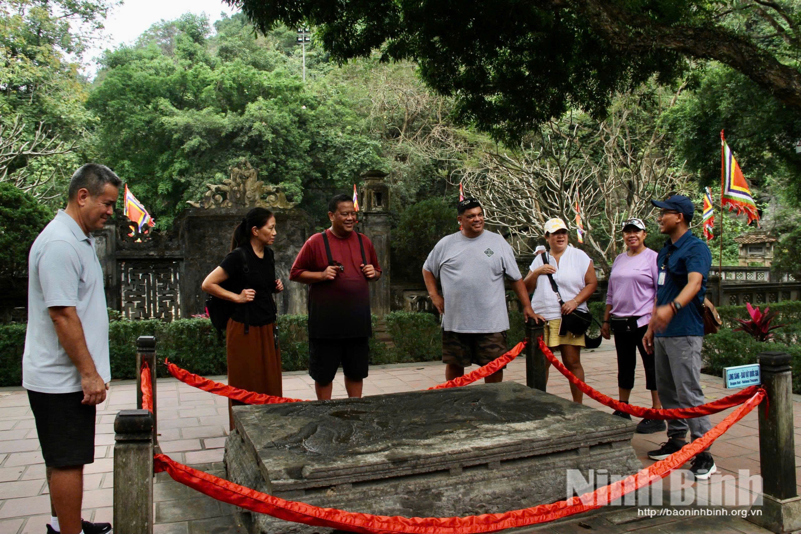 Du khách nước ngoài tìm hiểu về long sàng - một Bảo vật quốc gia tại đền thờ Vua Đinh Tiên Hoàng.