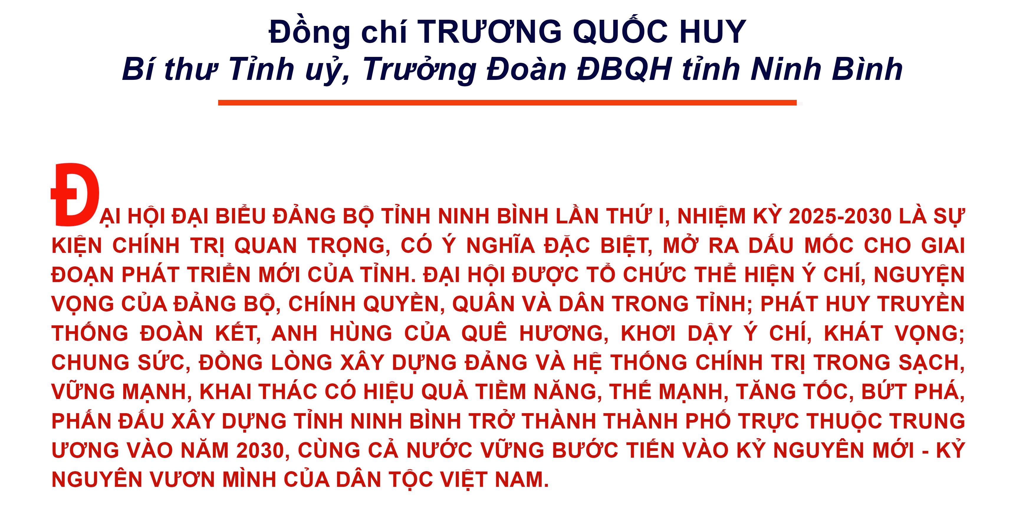 Phát huy sức mạnh đại đoàn kết, lấy đoàn kết trong Đảng làm hạt nhân cho đoàn kết mọi giai cấp, tầng lớp, đoàn kết cộng đồng, đoàn kết tôn giáo. Phát huy vai trò chủ thể, vị trí trung tâm của Nhân dân, mọi chủ trương, chính sách phải thực sự xuất phát từ nguyện vọng, quyền, lợi ích chính đáng, hợp pháp và hạnh phúc của Nhân dân. Kiên quyết xóa bỏ tư tưởng cục bộ địa phương, tâm lý vùng miền vì sự phát triển của quê hương, đất nước. Xử lý hài hòa mối quan hệ giữa xây dựng nông thôn mới nâng cao, nông thôn mới kiểu mẫu và phát triển đô thị, xây dựng quan hệ nông thôn - đô thị hòa hợp; giữa bảo tồn bản sắc văn hóa truyền thống, bảo vệ môi trường sinh thái và thúc đẩy tăng trưởng kinh tế, phát triển bền vững; giữa phát huy nguồn lực tại chỗ và huy động nguồn lực bên ngoài; giữa phát triển địa phương với liên kết vùng, tăng cường đối ngoại và hội nhập quốc tế. Dự báo trong nhiệm kỳ 2025-2030, Ban Chấp hành Đảng bộ tỉnh Ninh Bình nhận định tình hình thế giới và khu vực tiếp tục diễn biến phức tạp, khó đoán định, sẽ có nhiều thách thức và cơ hội đan xen; những chủ trương mới mang tính cách mạng của Đảng đã tạo động lực cho phát triển, nhất là sắp xếp đơn vị hành chính, tinh gọn tổ chức bộ máy, xây dựng chính quyền địa phương 2 cấp tạo không gian phát triển mới; đột phá phát triển khoa học, công nghệ, đổi mới sáng tạo và chuyển đổi số, xác định kinh tế tư nhân là một động lực quan trọng nhất của nền kinh tế; chấn hưng văn hóa, chấn hưng giáo dục được triển khai mạnh mẽ thực sự là sức mạnh nội sinh, nền tảng tinh thần thúc đẩy kinh tế - xã hội phát triển. Cùng với đó là thành tựu phát triển qua 40 năm đổi mới của 3 tỉnh Hà Nam, Nam Định, Ninh Bình được cộng hưởng và các tiềm năng, lợi thế được bổ sung cho nhau, bù đắp thiếu hụt lẫn nhau, tạo cơ hội cho phát triển; truyền thống đoàn kết, hiếu học, cần cù, sáng tạo là động lực quan trọng để tỉnh nhà tăng tốc, bứt phá, phát triển mạnh mẽ trong kỷ nguyên vươn mình của dân tộc. |